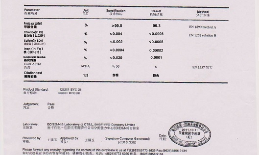 甲酸主含量≥85%,F(xiàn)e≤4ppm